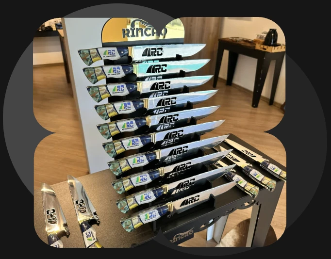Faca com cabo em acrílico personalizado ou madeira nobre, lâmina aço inox 420 C, vazada ou gravada a laser.
