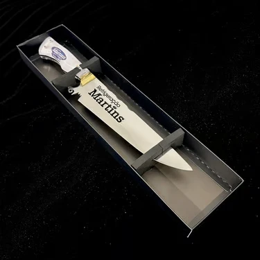 Faca com cabo em acrílico personalizado ou madeira nobre, lâmina aço inox 420 C, vazada ou gravada a laser.