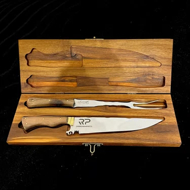 Kit de faca e garfo com caixa de madeira. Pode ser totalmente personalizado com a sua identidade.
